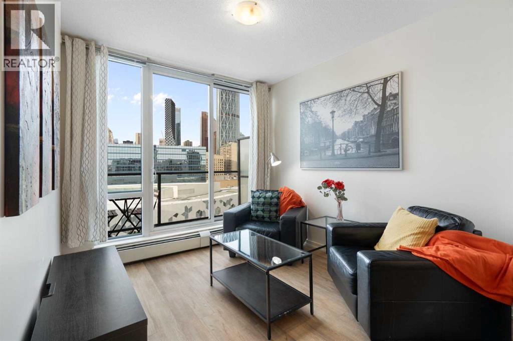 Welcome to this beautifully appointed, fully furnished home offering exceptional value in a prime downtown location. Designed for effortless urban living, this turnkey property includes all kitchenware and even a cruiser bike—perfect for exploring the city on foot or along the scenic river pathways. Ideally situated just steps from the LRT station, Superstore, Central Library, Bow Valley College, Tim Hortons, Stampede Park, and a wide array of shops and amenities, everything you need is truly within reach. The secure, professionally managed building is well maintained and presents beautifully. Inside, the bright and spacious one-bedroom unit is highlighted by floor-to-ceiling windows in both the living room and bedroom, filling the space with natural light and offering sweeping panoramic views. The open-concept design seamlessly connects the kitchen and living area, enhanced by durable vinyl plank flooring throughout. The modern kitchen features sleek high-gloss cabinetry, stainless steel appliances, quartz countertops, and the convenience of an in-suite washer and dryer. The living room extends onto a generous west-facing balcony—an ideal place to unwind while taking in stunning city and mountain views. A spacious primary bedroom and a well-appointed four-piece bathroom complete the interior. Residents enjoy access to premium amenities, including a fully equipped fitness centre, a rooftop patio with breathtaking views, secure bike storage, a communal lounge, and an additional storage locker. Offered fully furnished as shown, this stylish condo is an outstanding opportunity for those seeking comfort, convenience, and vibrant downtown living at an affordable price. For those with a vehicle, monthly parking is available in a city lot located directly across the street. (31891766)